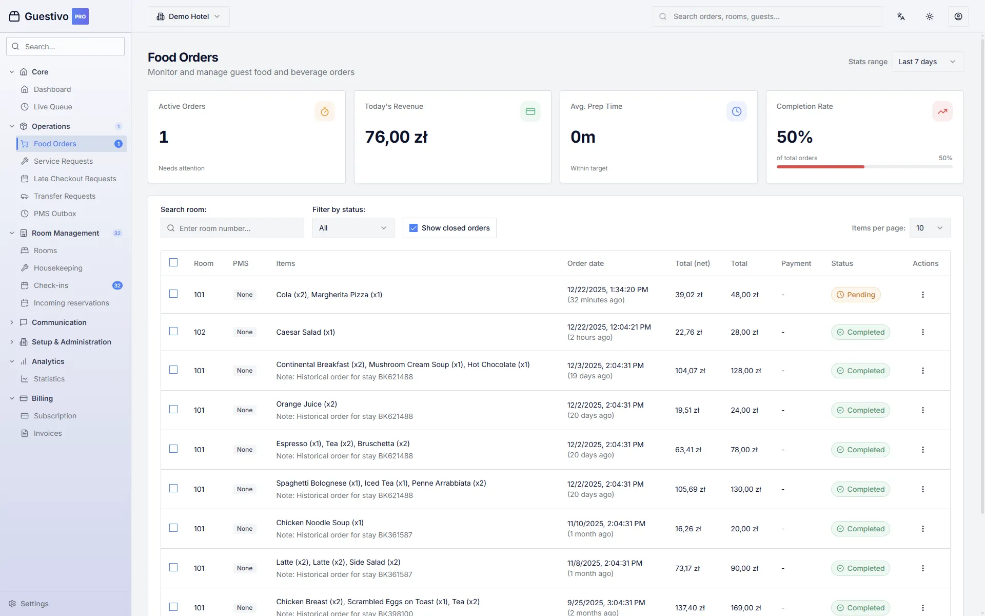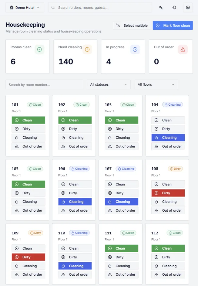 Live dashboard for orders, requests, and housekeeping with instant notifications.